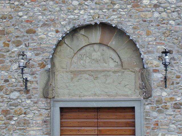 Of the ancient building remains only a very damaged bezel in sandstone located above the main entrance into which is carved the Archangel Michael that defeating the dragon and on the bottom you can still read the date: "ANNO [O] D. MCCXXIII".