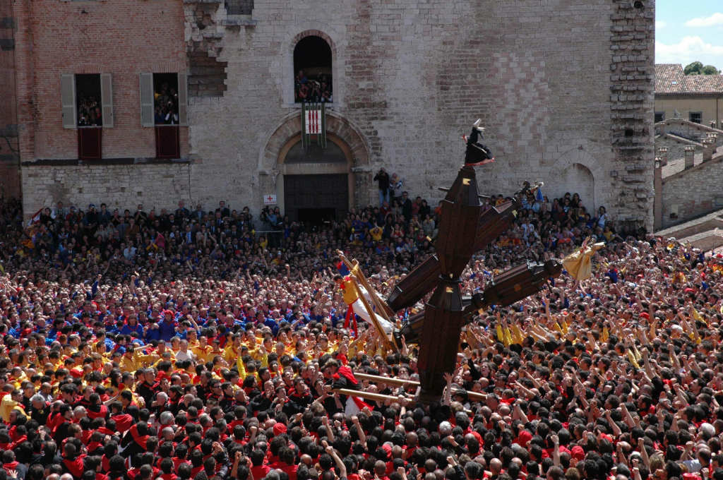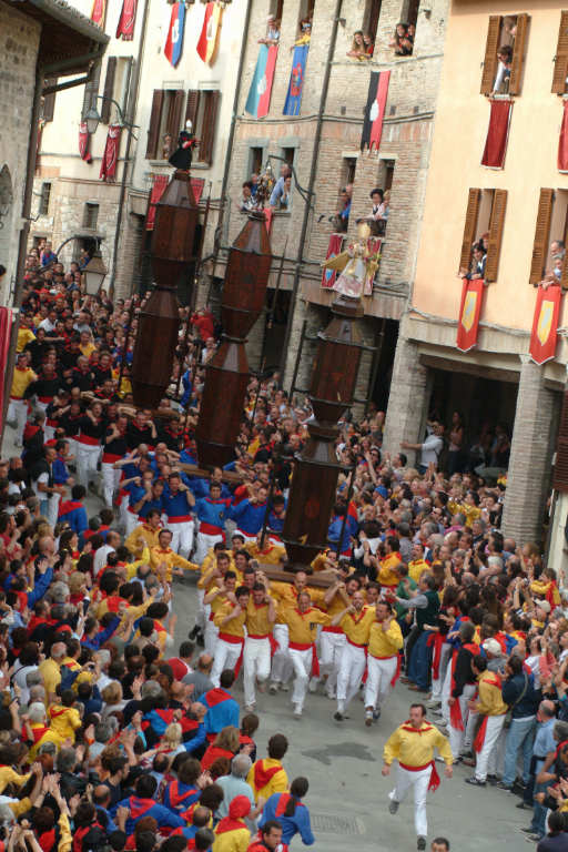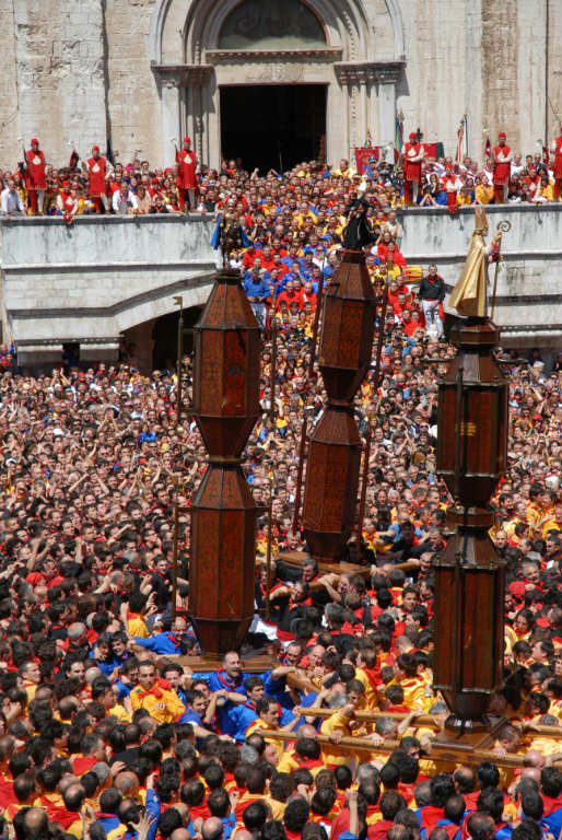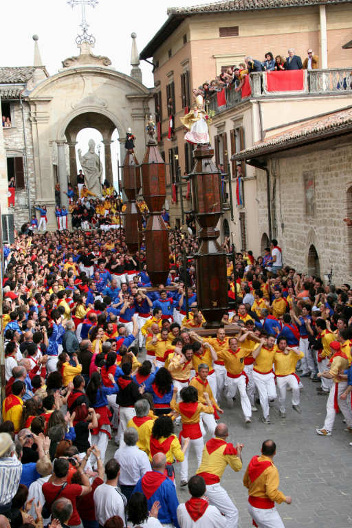 Festa secolare, si tiene ogni anno, il giorno della vigilia della celebrazione del Santo Patrono Ubaldo. I Ceri sono tre macchine lignee, alte circa 4 metri e del peso di circa 400 kg, composte da due prismi ottagonali cavi, sovrapposti e uniti internamente da un albero centrale che li attraversa completamente; l’albero viene “incavigliato” ad una “barella” di legno. Sulla sommità dei Ceri vengono collocate le statue dei tre Santi, con i quali si identificano le tre “famiglie” ceraiole: Sant’Ubaldo protettore dei muratori e scalpellini, San Giorgio dei commercianti e artigiani, Sant’Antonio dei contadini e studenti. La Festa, che coinvolge l’intera cittadinanza eugubina, si svolge in un incredibile scenario definito da suoni e colori: le divise dei ceraioli (camicia gialla per i Sant’Ubaldari, blu per i San Giorgiari, nera per i Sant’Antoniari), i canti tradizionali che riecheggiano per le vie della città abbellita dagli stendardi, l’urlo imponente della folla durante l’alzata e al passaggio dei Ceri, il suggestivo rintocco del “campanone”. Nel tardo pomeriggio, al culmine della Festa, inizia la grande Corsa; i Ceri vengono trasportati in corsa dal centro cittadino fino alla Basilica di S.Ubaldo, seguendo un itinerario prestabilito, dove le “mute” (gruppi di ceraioli di dieci persone) si predispongono lungo il percorso pronte a darsi il cambio. L’ordine dei Ceri durante il tragitto e all’ingresso nella Basilica è immutabile, con Sant’Ubaldo sempre in testa seguito da San Giorgio e Sant’Antonio. La Corsa si conclude con le preghiere di supplica e ringraziamento elevate al Santo Patrono Ubaldo. I Ceri per la loro importanza storica e culturale sono stati scelti come simbolo della Regione dell’Umbria.