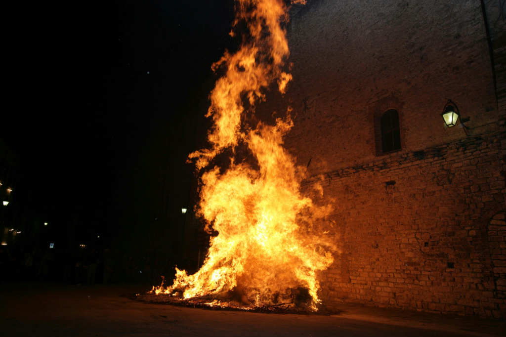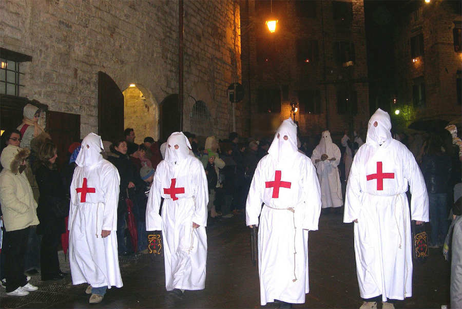 Organizzata dalla Confraternita Laicale di S.Croce, si svolge il giorno del Venerdì Santo di ogni anno e, partendo dalla Chiesa di S.Croce della Foce all’imbrunire, si snoda per le medievali vie della città, per poi farvi ritorno. Durante la Processione, vengono portate a spalla le statue della Madonna Addolorata e del Cristo, pregevole scultura lignea del ‘600, accompagnate dall’incessante suono delle “battistrangole” e dallo struggente incidere del “Miserere”, canto popolare che trova origine nelle Laudi della Confraternita dei Disciplinati Umbri del 1200.