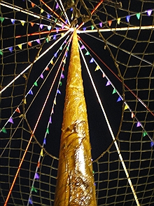 La seconda parte della festa si celebra sempre il 13 giugno di ogni anno. Un primo gruppetto di alcuni giovani di Isola alla presenza di una persona anziana, al mattino presto, ha tagliato sempre nel bosco, sotto le balze e non molto sopra il paese un nuovo tronco. Esso si chiama "Cima o Palo" ed èdella stessa essenza degli altri due, ma di dimensioni minime (tre metri circa); alcuni nel frattempo cercano una piantina di bosso le cui fronde serviranno per abbellire la stessa Cima e la Corona: un secondo gruppetto invece sta destreggiandosi intorno ai due tronchi per studiare il punto preciso dove realizzare l�incastro per poi unirli. Una volta eseguita con la tecnica descritta nel disegno i due innesti, gli adulti ponendosi a cavalcioni del tronco con l'ascia lo sbozzano e con il cortellaccio lo raschiano sino ad ottenere una superficie molto liscia. A circa due metri sotto la punta terminale di tutto il complesso ligneo, ormai unito in un solo tronco, viene sistemata la corona (come da disegno). La corona e la cima vengono rivestite con le rame del verde (il bosso). Ora il tutto sembra ormai un unico grande tronco che misura circa venti metri e oltre ed pronto per essere innalzato. Alle ore dieci circa inizia la fase vera e propria dell'inalberazione del Maggio nella buca precedentement6e preparata, un suono di campane annuncia questa ultima operazione. Un sistema misto di scale e corde, agganciate al tronco e passate in robusti occhielli attaccati ai muri delle case circostanti, permette il sollevamento di questo enorme peso piano piano la sua base scende nella buca predisposta ad ospitarlo. Questa viene poi riempita di terra e ciottoli che vengono pressati fortemente con pali e mazza. Il tronco viene controllato nella sua posizione di verticalità con l'angolo della chiesa: nel cuore di tutti c'è gioia, orgoglio e soddisfazione nel veder svettare verso il cielo la mole maestosa del Maggio. Si provvede alla rimozione dei canapi serviti per inalberarlo.