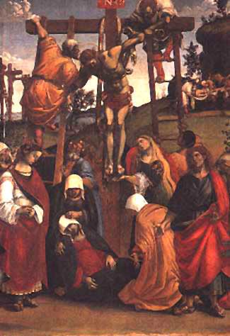 La Deposizione dalla Croce commissionata dalla Confraternita di Santa Croce al cortonese Luca Signorelli presumibilmente entro il 1515 e terminata nel 1516, data che compare in basso a destra sulla cornice originale, inglobata successivamente nel grande complesso ligneo intagliato nel 1611-12. Realizzata in un lasso di tempo molto breve, mostra come il pittore fosse ormai a capo di una organizzata bottega, che collaborava alle numerose commesse assegnate al maestro. Il tema principale della tavola, la Deposizione dalla Croce, è qui inserito dall´artista in un contesto più ampio, quasi un piccolo ciclo che illustra i momenti salienti della Passione di Cristo. E´ probabile che tale scelta sia da riferire alla volontà della Confraternita, in seno alla quale il tema della Passione era particolarmente sentito e fatto oggetto, ad esempio in occasione delle festività pasquali, di vere rappresentazioni " teatrali" i cui testi sono stati parzialmente tramandati. La lettura del dipinto può iniziare in alto a sinistra, dove le tre croci piantate sul Golgota segnano il momento della Crocifissione. Si passa poi alla scena centrale, la Deposizione, cui assistono il gruppo delle Marie, a sinistra, la Vergine già svenuta a terra, e la Maddalena, ai piedi della croce, colta nel tenero e disperato gesto di raccogliere con la mano il sangue di Cristo. Il gruppo si chiude a destra con la figura di San Giovanni, al di sopra del quale si scorge l´ultimo momento del ciclo, con il trasporto del corpo verso il sepolcro, durante il quale il Cristo, irrigidito dalla morte, viene compianto dai suoi cari. I tre pannelli di predella, data l´intitolazione della Confraternita alla Santa Croce, sono dedicati alla leggenda del " Ritrovamento della vera Croce di Cristo" , nella versione proposta da un testo molto diffuso nel Medioevo, la " Legenda Aurea" di Iacopo da Varagine. Il primo episodio, (curiosamente il pittore lo inserisce nella tavoletta centrale, sulla metà di destra) risale ai tempi del re Salomone, quando la regina di Saba, sua ospite, per ispirazione divina si inginocchia ad adorare un tronco di legno che fungeva da ponte presso un corso d´acqua. Quello stesso tronco, molto tempo dopo, sarà utilizzato per costruire la croce di Cristo. La narrazione, a partire ora dalla prima tavoletta di sinistra, prosegue con le vicende legate all´imperatore romano Costantino (IV secolo d.c.) che, come gli era stato suggerito in sogno, mette in fuga le armate di Massenzio grazie all´esposizione di una croce d´oro. Una volta " convertito" , è sua madre Elena ad adoperarsi nella ricerca della vera Croce (tavoletta centrale); ritrovata sul Golgota, quella di Cristo viene riconosciuta rispetto alle altre due perché, appena avvicinata ad un ragazzo morto, miracolosamente lo resuscita. Il racconto si chiude con un fatto avvenuto molto più tardi, nel VII secolo. Il re persiano Cosroe, conquistata Gerusalemme, si appropriò della Croce, che viene recuperata dall´imperatore Eraclio. Nella tavoletta di destra è raffigurato infatti l´ingresso trionfale della Croce in Gerusalemme, portata dallo stesso Eraclio. L´accesso alla città viene però impedito da un angelo, che invita l´imperatore a togliersi le vesti ed i calzari ed entrare in umili spoglie, esponendo la sacra reliquia. La vicenda artistica di Luca Signorelli Luca Signorelli (Cortona, 1445/50 -1523 ) figura tra i protagonisti della fase matura del Rinascimento, fase che coincide con i decenni finali del Quattrocento e l´inizio del secolo successivo. Nella sua lunga carriera opera al fianco e in competizione con i migliori artisti del momento (Perugino, Botticelli, Raffaello e Michelangelo), facendosi portatore di uno stile personale, caratterizzato da uno spiccato senso plastico e volumetrico. A determinare la fortuna del pittore, è la capacità di esprimersi in un linguaggio comprensibile, allo stesso tempo " monumentale" quanto " popolare" . Nasce artisticamente come allievo di Piero della Francesca, e gli insegnamenti del pittore di Borgo Sansepolcro, oltre ad improntarne I´ attività giovanile, torneranno di frequente ben riconoscibili nelle opere più mature. Non meno importanti saranno i contatti con l´ambiente di Urbino, ricco di stimoli per la presenza di pittori ferraresi, maestri fiamminghi, e dei più grandi architetti del momento, attivi intorno alla corte dei Montefeltro e al nuovo Palazzo Ducale. Della notorietà di cui il pittore godeva già intorno al 1480, sono testimonianza ben due commissioni papali per volontà di Sisto IV; la prima quando il pontefice lo chiama ad operare nella Basilica di Loreto, dove lascia gli affreschi della Sacrestia di San Giovanni; la seconda quando è invitato a far parte del gruppo di artisti impegnati nella grandiosa decorazione della Cappella Sistina, sotto la regia del Perugino. Nuovi stimoli il Signorelli troverà a Firenze, presso la corte di Lorenzo il Magnifico, colto mecenate e animatore di quel circolo di filosofi, letterati e artisti, che si riconoscevano nelle teorie filosofiche del neo-platonismo. Terminata nel 1492 la parentesi fiorentina, l´attività del pittore graviterà sempre più spesso in Umbria - notissima è la decorazione ad affresco della Cappella di San Brizio nel Duomo di Orvieto (1499-1504) - in particolare stazionando nell´area altotiberina, che ne aveva visto gli esordi. Qui, coadiuvato da una organizzata bottega, lascerà un cospicuo numero di opere con le quali, a volte riproponendo soluzioni già ampiamente sperimentate, altre offrendo proposte più originali, seppe comunque assicurarsi consensi di pubblico e numerosi " imitatori" . La Pala del Pomarancio La tela, raffigurante la " Madonna col Bambino in gloria tra Angeli e santi" , proviene dalla attigua chiesa di San Francesco, da dove è stata rimossa di recente per motivi di conservazione. In basso a sinistra si legge la firma dell´artista, Niccolo Circignani " de Pomarancio" , mentre sull´angolo opposto è la d