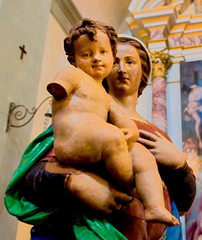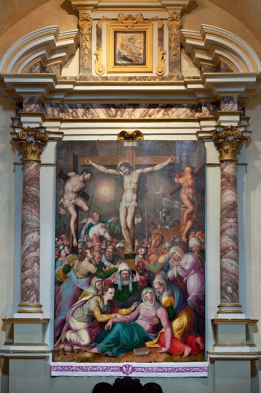 La chiesa, fatta edificare dalla Confraternita del SS. Sacramento tra il 1680 e il 1682, oltre alla navata ed al coro quadrato con volta a botte, ha sei cappelle internate nel muro, tre per parte. Conserva, al suo interno, pregevoli opere d'arte. Tra queste è da evidenziare, nella seconda cappella di sinistra, una bellissima Madonna con Bambino, in terracotta invetriata, di scuola Robbiana. Nella parete di fondo della stessa cappella troviamo anche la bellissima terracotta policroma raffigurante la Madonna col Bambino di Luca della Robbia Il Giovane. Nella prima cappella di destra invece merita una particolare attenzione una campana datata 1269. E' una tra le più antiche campane d'Italia.Una delle opere più significative di questa chiesa si trova nel transetto a destra dell altare principale, ed èla Crocifissione di NiccoloCircignani detto il Pomarancio, recentemente restaurata. E' composta di ben quarantadue figure e reca in basso la seguente scritta: NicolausCircignanus de Pomarancio Pinx.it e Giannis Petri Meozi amore dei opus hoc fieri fecit 1570. Nella parte superiore è tutto un turbinio di figure. I corpi contorti si volgono verso il Cristo o verso la Vergine. Sopra a tutto svettano le Croci ed in primo piano il Cristo ormai morto, ma trasfigurato in una solenne maestà.