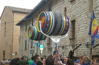 The Race of the barrels of Costacciaro born in 1991 at the idea of Archangel Torcolini, the same inventor of the chariot race of Shard. The party does not appear to be linked to any religious figure, but rather celebrates the period of fermentation, hence the prize trophy of San Martino. He was held for more editions of the 90 then suspended because the turbulence between the two teams. In 2009 a group of young people by banning "Let youth" promoted the territorial No. 7 and the Regione Umbria, was able to recall the Race, in rewriting the rules and symbols. The festival is a real race of two barrels that roll around an axis which is attached to a rudder, pulled by a team of young, called "bottaioli". For each team there are also a leader bottaiolo, an innkeeper and a race director. The two barrels and their teams rely, in competition, in Costacciaro capital (La Porta Hostaria) and fractions, in particular that of the Villa Col 'de Canali (Hostaria de la Rocca). The race is divided into two rounds, or three in case of a tie, all-time. Triumphs who first succeeds in winning two victories. During the period of the festivals are staged their Hostarie. For the teams Costacciaro, the festival coincides with the Porte de Hostaria race day, while the Hostaria de la Rocca, one of the fractions, the merry evening the night before. In typical cellars of San Martino among others, chestnuts and wine are offered.