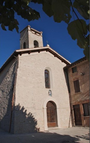 Externally, the building lost its original architecture over the centuries; on the other hand, the interior maintained the original single-nave structure divided into three bays, the first two surmounted by cross vaults, the last one featuring a common tunnel vault and an apse. The sacristy was added in the second half of the nineteenth century. Next to the church stands a tall medieval bell tower, almost like a watchtower, and the parish house, built in 1880. The church used to host many valuable artworks, while today it only keeps the remains of some paintings, some of them by Matteo da Gualdo.
