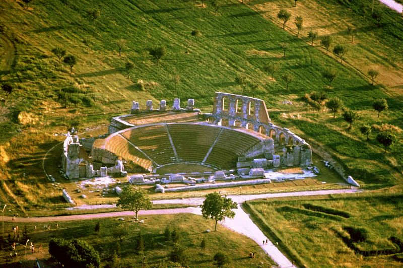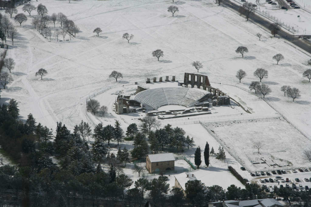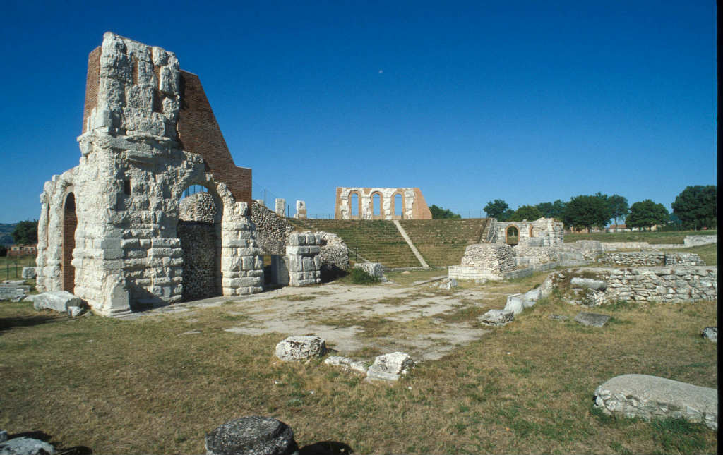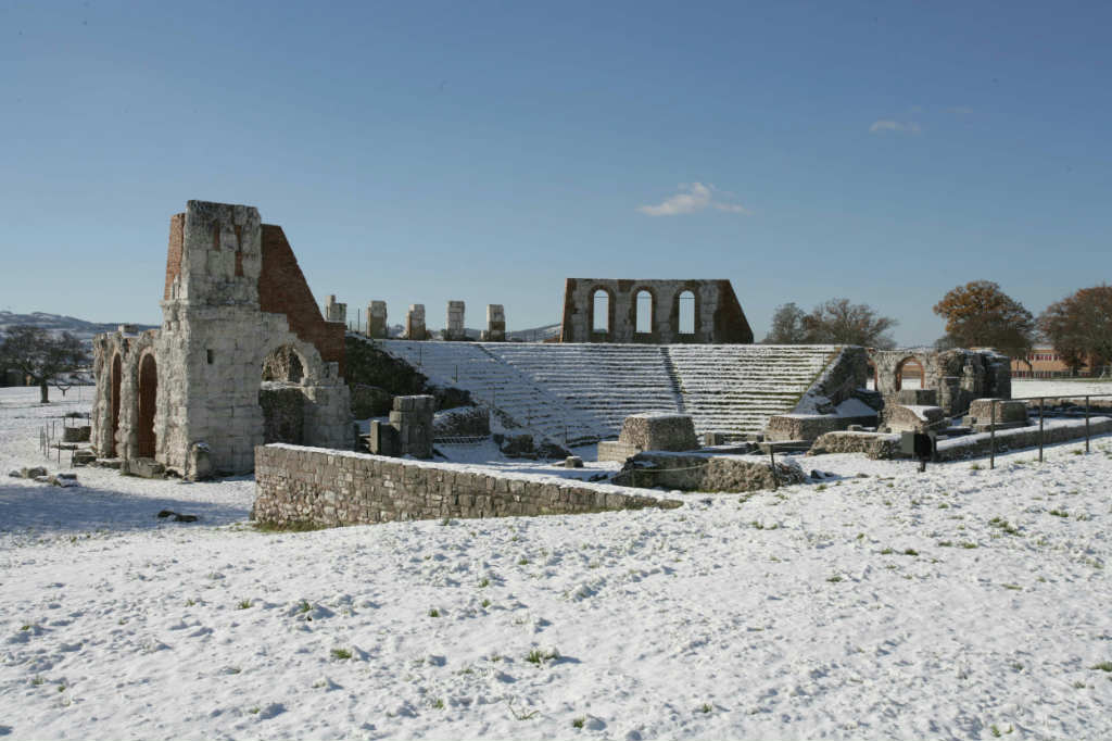 Audioguida (52) Poco sotto le mura, fu costruito probabilmente verso la fine del I secolo a.C. nel centro del secondo insediamento della città romana ed era in grado di ospitare fino a 6000 spettatori. Dalla forma semicircolare, tipica dei teatri dell’età repubblicana, presenta una cavea, il cui diametro è di 70 metri, divisa in quattro cunei da scalette per l’accesso alle gradinate. All’apice del settore superiore insisteva un portico formato da 27 arcate in opera quadrata. Un podio alto circa un metro divideva l’orchestra dal proscenio. La struttura quale oggi è visibile si deve ai restauri effettuati tra ‘800 e ‘900. Ospita una qualificata stagione estiva di spettacoli classici. Reperti archeologici di scavo, provenienti anche da altre zone della città, sono raccolti nel vicino Antiquarium, accanto a pannelli con immagini e didascalie analitiche.