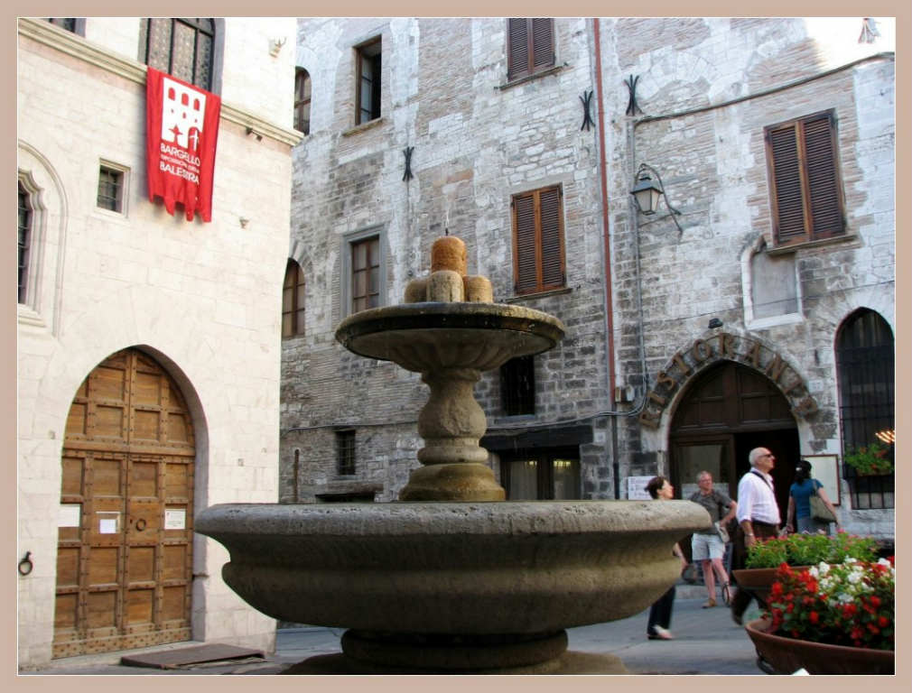 Nella piazzetta antistante, la “Fontana dei Matti” (‘500); secondo l’antica tradizione chi compie tre giri attorno ad essa riceve simbolicamente la “patente di matto” che conferisce quella vitalità che contraddistingue il popolo eugubino.