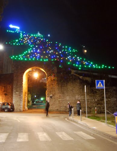La porta è posta a sud delle mura, nelle adiacenze della Porta del Ponte Marmoreo, non più esistente. Dal nome si evidenzia che serviva per raggiungere gli orti che producevano frutta e verdura, posti nell’immediata periferia dove un tempo sorgeva la città romana. Fu chiusa molto probabilmente in occasione della costruzione dell’Ospedale Grande tra il 1749 ed il 1766. Nel 1928, mentre si abbassava il terreno adiacente alla chiesa di S. Francesco per riaprire l’antica Porta degli Ortacci, sono venute alla luce parecchie tombe in travertino ornate di fregi bizantini e reperti di epoca romana certamente riferiti alle terme dell’antica città. Da molti autori è individuata come Porta S. Francesco, una delle tre porte del Quartiere di San Giuliano, proprio per la sua vicinanza al convento ed alla chiesa del santo assisiate.