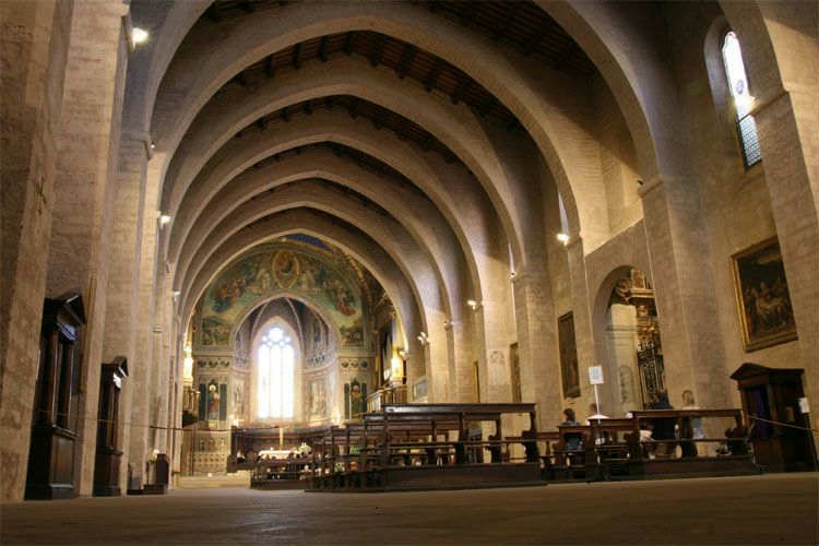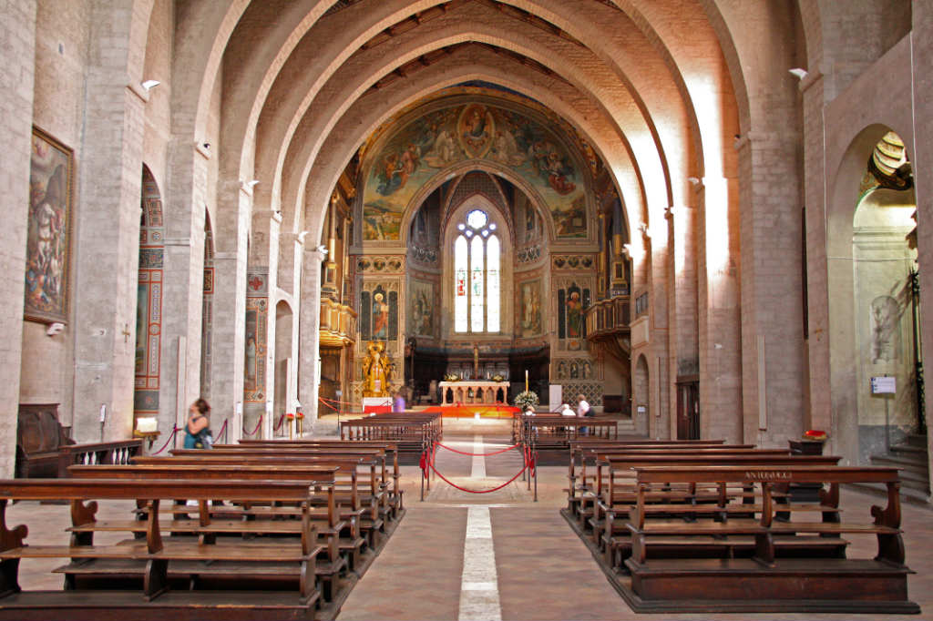 A sin. dell'altare maggiore è il Seggio dei Magistrati , con finte tarsie di Benedetto Nucci. Nel coro si trova il Seggio episcopale, intagliato verso la metà del sec. XVI. Il sarcofago tardo-antico sotto l’altare maggiore contiene le reliquie dei SS. Giacomo e Mariano, titolari della chiesa. Sulle pareti del tempio rimangono tracce di affreschi dei secc. XIV e XV. Le pitture murali dell’abside, dell’arco trionfale e delle cappelle di sin., sono opera di Augusto Stoppoloni (1916-18).