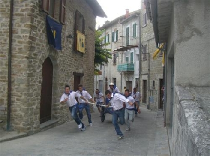 Nativity of the SS. Virgin. Opening of the wineries of the districts, religious and cultural events, traditional cuisine, games and fireworks. On the feast of the Nativity of the Virgin Mary, to Scheggia, takes place the chariot race. The festival is a time trial between the two districts of the country: "il Borgo" and "la Piazza". The "Borgo" represents the periphery of the village, while the District's Piazza is the center of Scheggia. To distinguish the two groups were chosen emblems, symbols and colors. The chariots, one for each District, are pulled by four men, along the way, are replaced by others until you reach the finish line. On the morning of the Feast, "the Tamburine" travel the country and neighboring areas. After a breakfast of "charioteers", those who drive the chariot, the Holy Mass is celebrated. In the afternoon, the race takes place, waiting with trepidation and